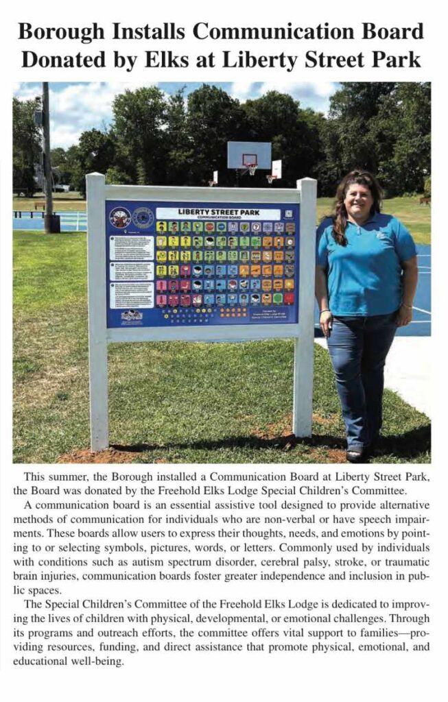 The Freehold Elks Special Children’s Committee was featured in the Freehold Borough Newsletter for their amazing work installing a new communication board at Liberty Street Park! Huge kudos to our Special Children’s Chair, Jessica Schoener, and her incredible team for making this project a reality!