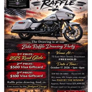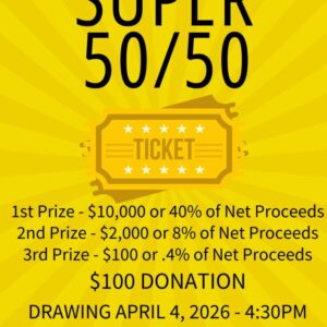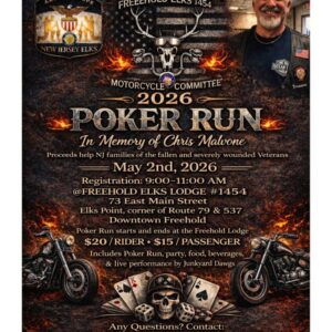 1st Prize – $10,000 or 40% of Net Proceeds 2nd Prize – $2,000 or 8% of Net Proceeds 3rd Prize – $100 or .4% of Net Proceeds $100 DONATION DRAWING APRIL 4, 2026 – 4:30PM at Freehold Elks – 73 E. Main St, Freehold NJ *Ticket admits two to drawing party at 2:00PM