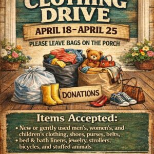 Please leave bags on the porch Items accepted are new or gently used men, women and children’s clothing, shoes, purses, belts, bed and bath linens, jewelry, strollers, bicycles and stuffed animals. NO pillows, books, toys, furniture, appliances, or household items.
