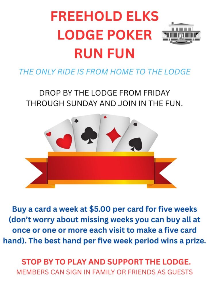 Freehold Fun “No Ride” Poker Run Come to the Lodge on a Friday, Saturday or Sunday to play. + Add to Google Calendar + iCal / Outlook export Date Sep 17 2025 - Sep 17 2026 Ongoing... Cost $5.00 Location Freehold Elks Lodge 1454 73 E Main St Freehold, NJ 07728 Share this event
