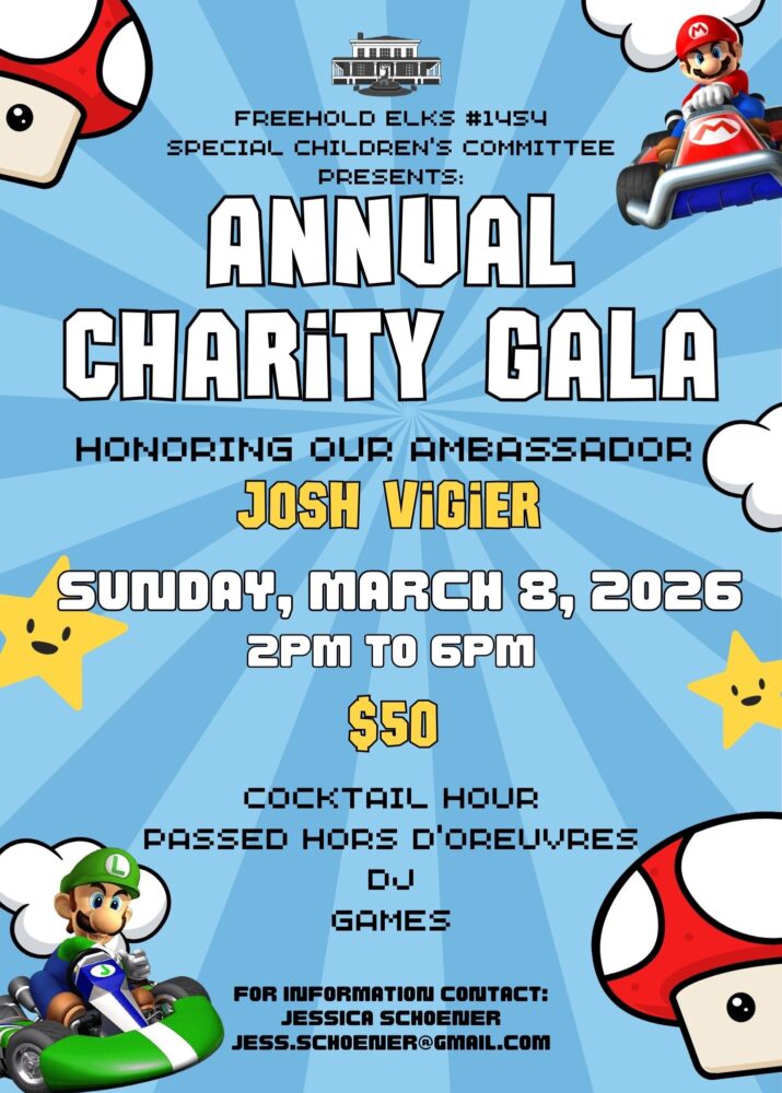 Special Children’s Gala Cocktail HourPassed Hors D’OeuvresDJGames + Add to Google Calendar + iCal / Outlook export Date Mar 08 2026 Time 2:00 pm - 6:00 pm Location Freehold Elks Lodge 1454 73 E Main St Freehold, NJ 07728 Share this event